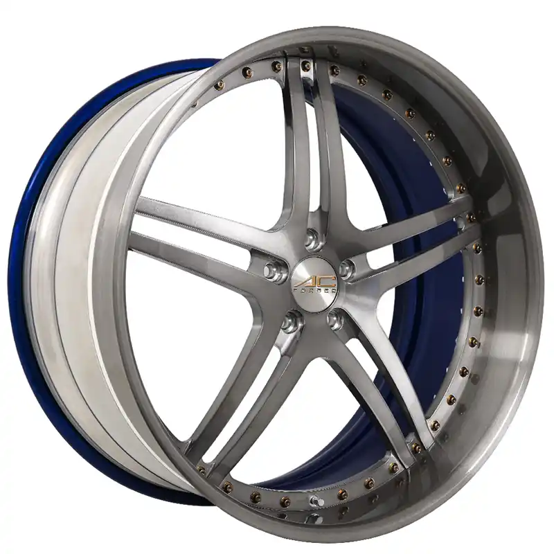 22″ AC Forged Wheels ACF702 Brushed Double Dark Tint Face with Color Matched Blue Inner and Gloss Monica Polished Rivets Rims Best Choice
