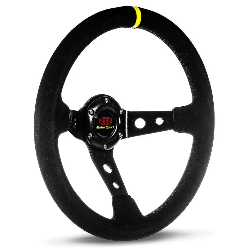 This 14″ deep dish steering wheel is wrapped in black suede and features a bright yellow centre marker stripe at the 12 o’clock position. The brushed black spokes with circular holes enhances the sporty looks of any vehicle.
