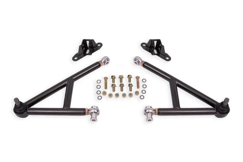 Fits 2011-2014 Mustangs;Fits 2011-2014 Shelby GT500s;Manufactured from heavy-duty 4130 steel and 6061 aluminum;Includes Grade 8 hardware;Includes new 19mm ball joints;Eliminates A-arm deflection;Better steering feel and response;Improves geometry and front-end stability during hard launches;Designed for hardcore drag racing applications;Narrows track width 1.5-inches overall;Lightweight design;Available in red and black hammertone powder coat for long lasting good looks;2-3 hour installation time;Proudly designed in the USA!;Proudly made in the USA!