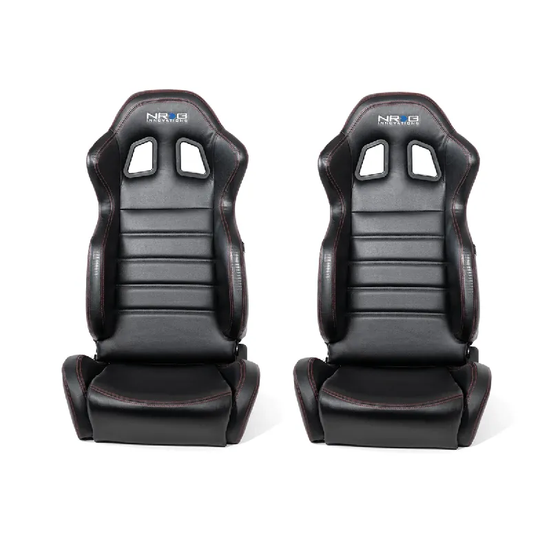 Crafted from durable black PVC leather with bold red stitch accents, these seats combine long-lasting quality with aggressive aesthetics. The reclinable design allows for personalized comfort, adapting easily to your driving position. Sold as a pair, they ensure a balanced upgrade for both driver and passenger, making them ideal for weekend cruisers, show cars, or track builds.
