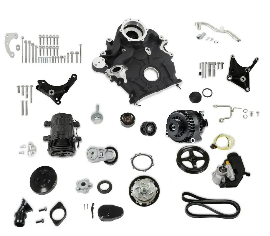 Holley’s high-mount accessory drive has everything pulled up and in tighter than other options. The patent pending accessory drive incorporates the timing cover, water pump, alternator, A/C and P/S. This system works with the factory crank pulley, as well as aftermarket damper/pulleys.