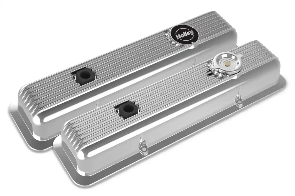Holley Valve Covers – Muscle Series – Finned – SBC – Polished Chevrolet Small Block – Perimeter Bolt – Cast Aluminum Exclusive