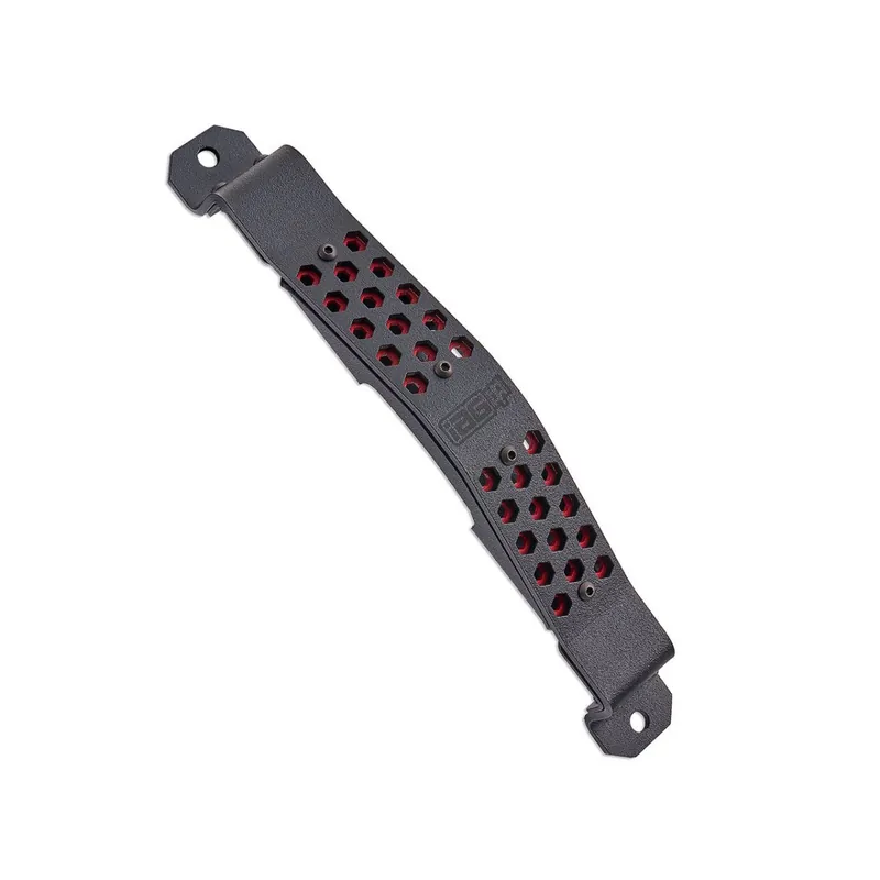 Crafted from corrosion-resistant 304 stainless steel with a black powder-coated finish, this tie down is precision laser-cut and formed in the USA. It includes two color-coated aluminum plates that align with the hex cutouts, providing a subtle but striking red accent. Compatible with the OEM battery base and hooks, it also fits select Scion FR-S, Toyota 86, Toyota GR 86, and Saab 9-2X models. The kit includes the tie down, color plates, Allen key wrench, and hardware for easy installation.