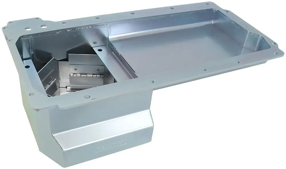This race oil pan features a trap door setup to keep oil within the oil pick up area under any condition. The OEM windage tray may be used with this pan or purchase separately the Aeroflow Performance windage tray AF82-2020 for improved oil control in any application.