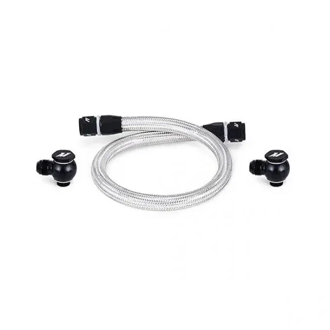 - Premade braided stainless steel oil line and aluminum fittings replace corrosion-prone stock rubber line