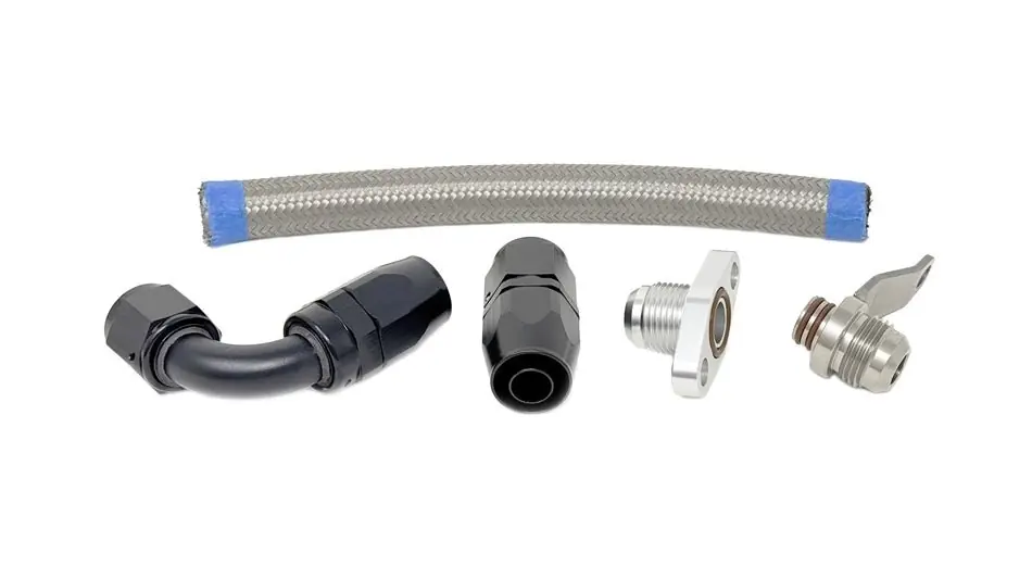 Torque Solution DIY -10AN Turbo Oil Return Line Kit is the perfect solution for making a custom -10AN oil return for your stock location turbo. This head fitting is made from CNC stainless steel, and we provide a billet aluminum ported turbo drain fitting. Both come with fkm rubber o-rings ensuring a leak-free seal. Our ported turbo drain flange is designed to prevent pooling at the turbo, that is common with standard flanges making this kit a great choice to ensure your turbo stays healthy longer.