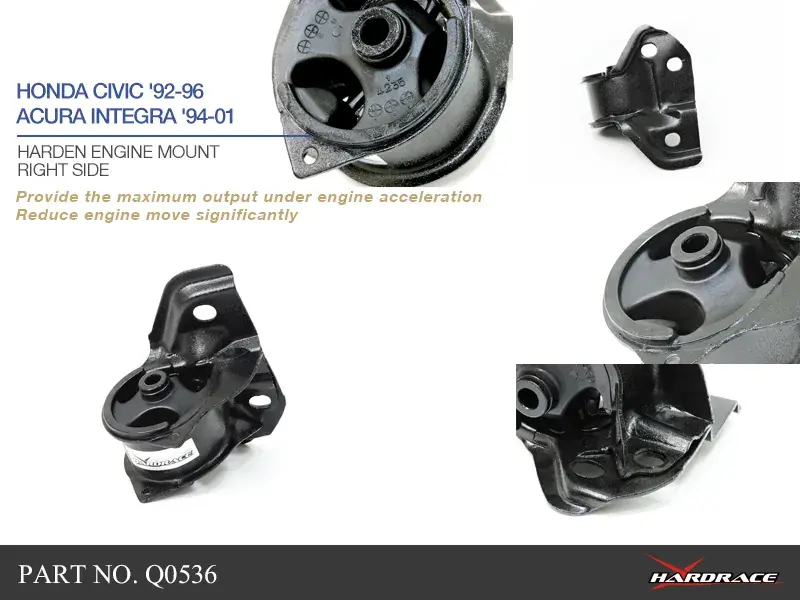 Hardrace reinforced hardened rubber engine mounts provide more strength than OE rubber mounts. Harden rubber mounts reduce engine movement significantly, providing the maximum output under engine acceleration.