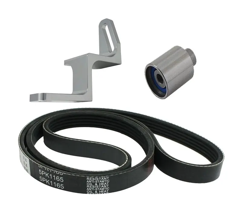 Crafted from durable 6061 billet aluminum and finished with a clear anodized coating, this silver bracket resists corrosion while providing a sleek, high-quality look. The kit includes all necessary hardware, a new alternator belt, and an idler pulley for a complete, hassle-free installation. Note that some modification to the OEM alternator bracket and removal of the A/C are required, along with custom turbo piping.