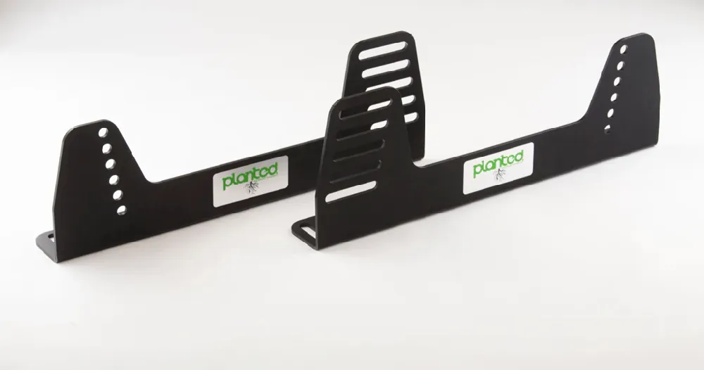 The Planted Steel 90 Degree Universal Side Mount is made from 1/8th inch thick steel which complies with FIA’s required thickness, weighs approximately 5.5 lbs, and is powder coated black. These will fit Side Mount Seats offered by most seat manufacturers and have been tested on Bride, Corbeau, Cobra, Momo, NRG, OMP, Ractech, Recaro, Sabelt, Sparco, Status Racing & Takata. The wider slots allow the Side Mounts to be compatible with most other seat manufacturers as well but we have not test fitted them all. The Side Mounts are made to bolt directly to sliders but have multiple slots for adjustability when direct mounting (eliminating sliders).