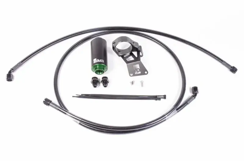 This kit is compatible with all Mitsubish Lancer Evolution X vehicles. It is used to upgrade the fuel feed line on the Evo X. The factory fuel feed line is 5/16″ (8mm) inside diameter, which can become a restriction when using high flowing aftermarket fuel pumps. The Radium fuel feed line kit uses prefabricated -8AN PTFE fuel lines (1/2″ inside diameter) with machine-crimped hose ends and a Radium high-flow fuel filter. The hose lengths are designed to reach from the fuel pump hanger area (underneath the rear seat) up to the fuel rail. The filter mounts under the car by the steering rack using a specially designed bracket that uses preexisting holes, so no drilling is required.