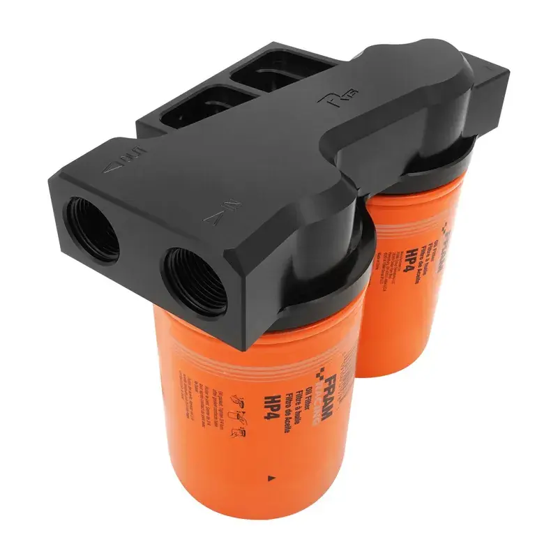 RTS RTS Remote Oil Filter Head With FRAM HP4 Filters 13/16”-16 Thread Dual Filters AN12 ORB Ports Billet Aluminium Black Fresh Stock