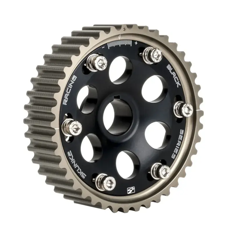 In order to maximize horsepower, it is critical that camshafts are set at the proper position relative to crankshaft position. Skunk2 cam gears enable serious tuners to optimize horsepower and torque by adjusting camshaft timing, and to place power where they need it most. Using the laser etched timing and directional marks, precise camshaft adjustments can be made quickly and easily. Skunk2 cam gears feature CNC precision machined and hard anodized teeth to reduce premature wear; Skunk2’s signature 6-bolt design eliminates any chance of the gear slipping. Skunk2s lightweight designs reduce rotational inertia resulting in increased engine response and acceleration. Skunk2 cam gears have been proven on racecars in the most extreme conditions for over a decade.Pro-Series cam gears feature a super lightweight design and are CNC machined from 7075-T6 billet aluminum. Each gear has laser etched timing marks with +/-10 cam degrees of adjustment and feature Skunk2s proven 6-bolt design. The outer gear is hard anodized for durability and the center hub is Titanium anodized for that racing look. Pro-Series cam gears are 5% lighter than our already ultra-lightweight Tuner Series cam gears. * CNC Machined 7075 Aluminum * Hard Anodized Outer Gear * Industry Leading 6-Bolt Design * +/- 10 Cam Degrees of Adjustment * 35% Lighter Than Factory Gears * 5% Lighter Than S2 Tuner Series