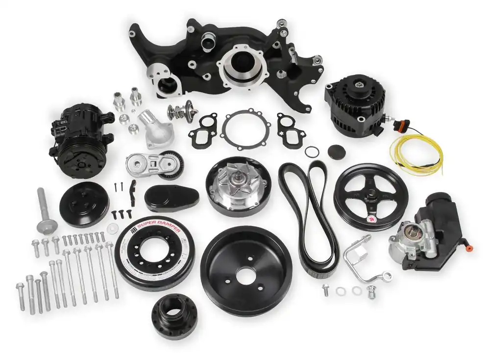 When we say “complete”, we mean complete. The Mid-mount system comes with everything you need. All accessories are included; the water pump, A/C compressor, Alternator, P/S pump with reservoir, and an SFI certified damper w/hard anodized billet crank pulley. All pulleys and the belt are supplied. Even heater hose adapters, power steering to -6 AN hardline, and the alternator plug/harness are included. Easy assembly was a priority during the entire development of this accessory solution. Color graphical instructions walk you through every step of the ultra-easy installation.