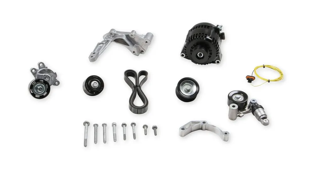 The components have an original equipment look and reliability while relocating the alternator in closer to the engine block for additional chassis clearance. The base kit Holley Part #20-226 is offered with a standard cast finish 105 amp alternator.Our premium kits, Holley #20-224 or #20-224BK offer the choice of a premium 150 amp alternator in cast or black finish.