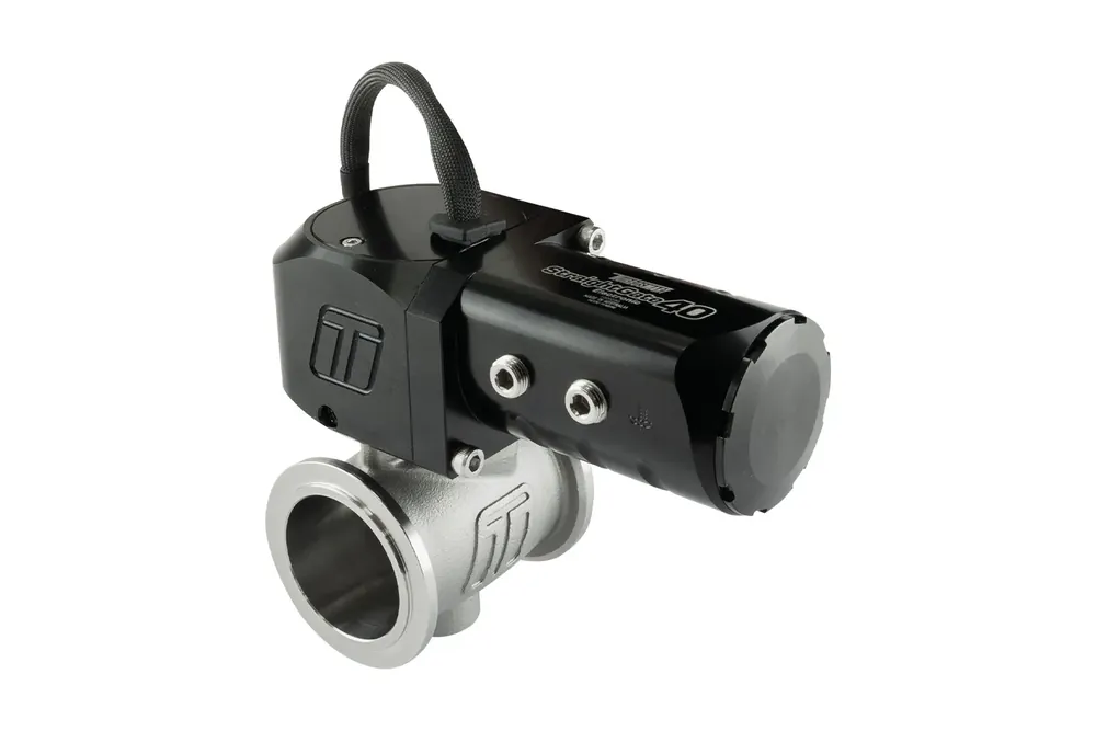 The StraightGate40 from Turbosmart is the smallest butterfly style external wastegate for tight engine bay confines and fitment. The StraightGate40 is a zero-offset butterfly style wastegate which allows enormous flow and almost linear control with unparalleled boost control throughout the entire operating range. Turbosmart’s eSG40 Electronic StraightGate is a Patent Pending and based on the success of the Multiple Award Winning, World First eSG50 Electronically Actuated Butterfly Style External Wastegate. No reference hoses, no springs and no diaphragms means full electronic control via a servo motor and Turbosmart’s zero-backdrive gearbox which results in lower current demands as well as operation stability against huge drive pressures. The Electronic StraightGate40 includes onboard sensors covering actuator temperature as well as valve position in both analog and digital. The Electronic actuation results in the widest possible tuning window from zero boost (if manifold priority allows for it) to all available boost. The Turbosmart StraightGate40 has been designed from the ground up and validated in-house to create a new level of control and flow, never seen in any wastegate before it. The zero-offset butterfly valve is subjected to exhaust drive pressure equally on both halves of the valve which pivots centrally, resulting in a valve that is self-balanced against any drive pressure. This self-balancing means less work is required to actuate against even the highest of drive pressures and a wider tuning window is possible, no matter how the valve is actuated. The increased flow is achieved through the efficiency of a straight through valve versus a traditional poppet style valve where the exhaust gas must be turned 90 degrees by the valve. Available in StraightGate40 StraightGate50