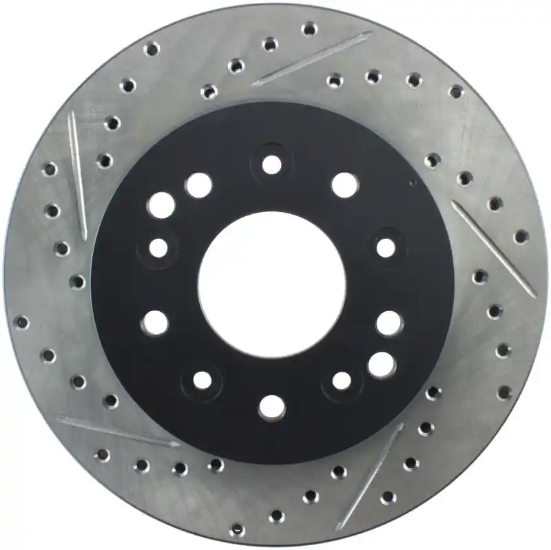 StopTech Drilled and Slotted Sport Rotors are 1-piece direct replacement brake discs for factory brake systems and stock calipers that look great behind your wheels – and offer significantly improved braking performance. The unique cross-drilling and slotting aids with heat and brake dust dispersal; prevents glazing of the pads; adds bite and improves wet and dry braking performance. Built to last; the black e-coating provides protection from corrosion and the high carbon metallurgy (in most applications) offers quieter operation; better crack resistance and increased performance.